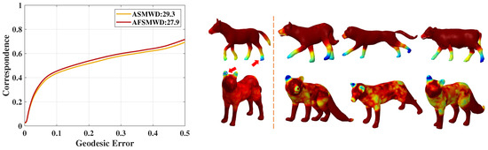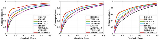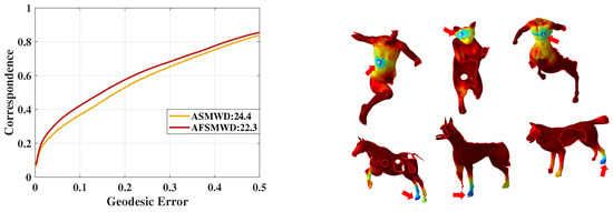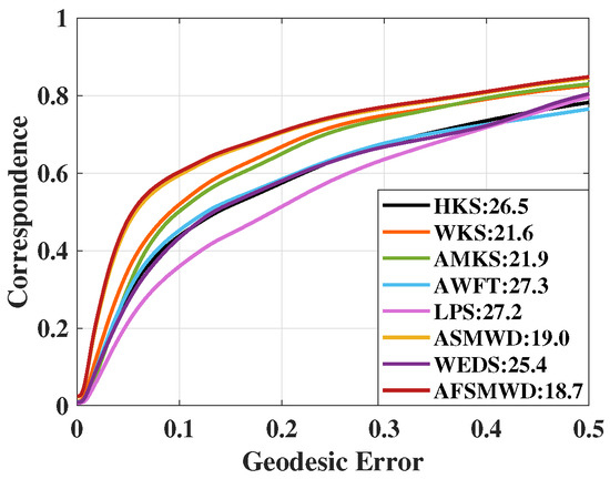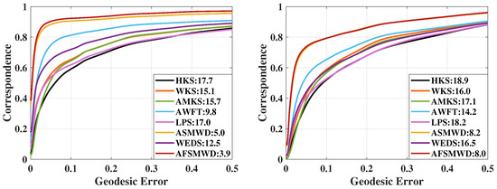 Evaluation methodology. Further, we use correspondence quality characteristics (CQC) curves [49] and average geodesic error (AGE) to evaluate matching performance. To be specific, assuming the point x on shape is matched with the point y on shape , while its ground-truth correspondence point is actually on , then the matching error is computed as the geodesic error , where the geodesic distance between points y and is normalized by the diameter of shape . CQC curves exhibit the percentage of matches that are at most r in geodesic error. Moreover, the AGE is obtained by ; here, N is the number of vertices of shape . Obviously, higher CQC curves and smaller AGE express more accurate matching results.
