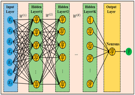 For each layer, the weight matrix is denoted as , the bias vector as , and the activation function for each layer as . Additionally, the input for the first hidden layer is denoted as , as shown in Formula (2):
