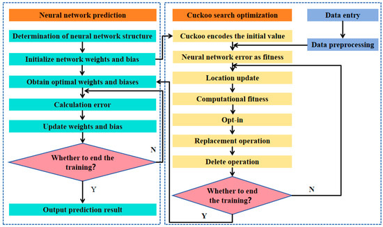 Based on the process of updating weights and biases in the neural network according to the Formula (6), it can be observed that neural network models often treat local optima as global optima, leading to the problem of local optima. Therefore, in this study, by considering the process of the CS algorithm, the CS algorithm is utilized to perform global optimization on the neural network to optimize the update of weights and biases. This approach effectively avoids the neural network model falling into the problem of local optima while enhancing the learning efficiency of the neural network. The specific algorithmic process is illustrated in Figure 2.