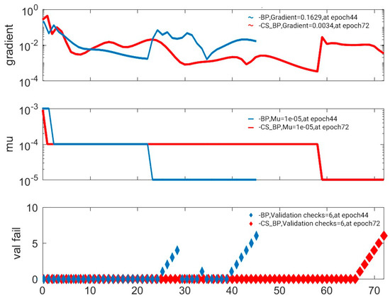 The error descent curve can be used to statistically analyze the error between the neural network predicted results and the actual results. As shown in Figure 3, the blue line represents the error reduction curve of the neural network, while the red line represents the error reduction curve of the CS-optimized neural network. In Figure 3, “Gradient” indicates the variation curve of the training set during iterative training, “Mu” denotes the momentum constant or momentum parameter with a range of 0 to 1, and “vall fail” signifies the generalization degree of the predictive model during training. It can be observed from the figure that the neural network prediction model starts to converge at the 60th iteration, whereas the CS-optimized neural network prediction model begins to converge around the 72nd iteration. This indicates that, while the neural network prediction model enters a local convergence state, the CS-optimized neural network prediction model continues to search for the global minimum.
