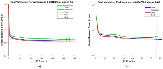 Figure 4a shows the error curve during the training process of the neural network prediction model, and Figure 4b shows the error curve during the training process of the Cuckoo-optimized neural network prediction model. As the iterative training progresses, the performance of the network continuously improves. It is evident from Figure 4a that the neural network prediction model reached its optimal performance at 54 iterations, while the Cuckoo-optimized neural network prediction model reached its optimal performance at 66 iterations. This further indicates that the neural network prediction model has entered a local optimum.