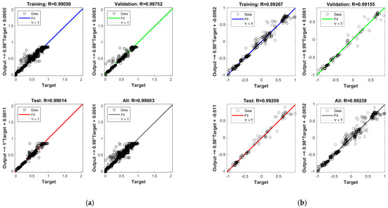 The fitting results of the prediction model are shown in Figure 6. Figure 6a represents the fitting results of the neural network prediction model, while Figure 6b represents the fitting results of the Cuckoo-optimized neural network prediction model. In Figure 6a,b, the top-left corner shows the correlation diagram of the training set, the top-right corner shows the correlation diagram of the validation set, the bottom-left corner shows the correlation diagram of the test set, and the bottom-right corner shows the overall correlation diagram. The size of the R value in the figure reflects the goodness of fit, with a higher R value indicating a better fit. From Figure 6a, it can be observed that the correlation coefficients for the training set, validation set, and test set of the neural network prediction model are 0.99058, 0.98752, and 0.99014, respectively. In Figure 6b, the CS-optimized neural network prediction model has correlation coefficients of 0.99267, 0.99155, and 0.99209 for the training set, validation set, and test set, respectively. These represent an improvement of 0.21%, 0.41%, and 0.20% in the correlation coefficients on the training set, validation set, and test set compared to the neural network prediction model. The overall correlation coefficient of the neural network prediction model is 0.99003, while the Cuckoo-optimized neural network prediction model achieves an overall correlation coefficient of 0.99239. In terms of overall correlation, the Cuckoo-optimized neural network prediction model outperforms the neural network prediction model by 0.24%. This indicates that using the CS-optimized neural network prediction model results in better predictive performance.