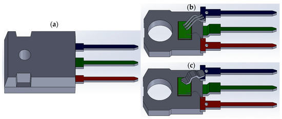 TO247 MOSFET package models: (a) TO247 MOSFET package with encapsulation; (b) aluminum wire bonded TO247 MOSFET package; (c) copper clip bonded TO247 MOSFET package. The colors indicate key components of the MOSFET package: light green represents the die, deep green represents the drain terminal, blue denotes the source terminal, and red indicates the gate terminal.
