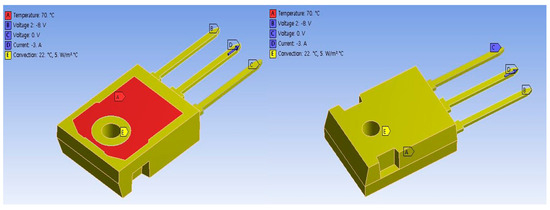 The Computer-Aided Design (CAD) for both the aluminum wire bonding and copper clip bonding models for the TO247 MOSFET package were developed using SOLIDWORKS [38]. Figure 3 illustrates the CAD models created for the aluminum wire and copper clip bonding in the TO247 MOSFET package. These models are crucial for conducting FEA simulations, as they accurately represent the intricate structure of the MOSFET package. This study initially focuses on the static thermal electric conduction analysis of two different TO247 packages based on wire bonding and clip bonding, conducted using the ANSYS simulation program [39]. Table 1 presents the data according to which the material properties, including thermal conductivity and electrical resistance, were assigned.