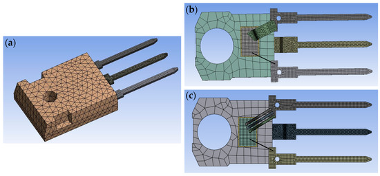 Mesh generated for TO247 MOSFET package models: (a) mesh generated for TO247 MOSFET package with encapsulation; (b) mesh generated for copper clip bonded TO247 MOSFET package; (c) mesh generated for aluminum wire bonded TO247 MOSFET package.