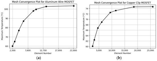 Mesh convergence plots for MOSFET thermal analysis: (a) mesh convergence for aluminum wire MOSFET; (b) mesh convergence for copper clip MOSFET.