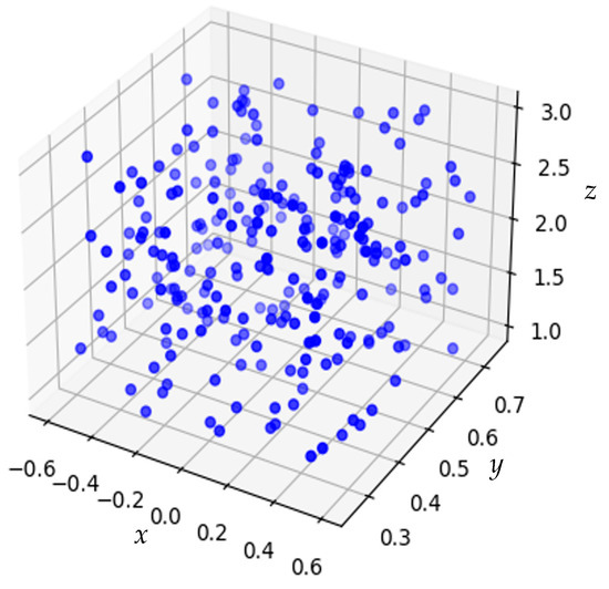 A 3D scatter plot of the LHS results for the copper clip parameters, where the x-axis represents the parameters. The x-axis, y-axis and z-axis represents the values of parameter a (horizontal length from the die edge to the clip), parameter c (clip thickness), parameter b (clip width), respectively.