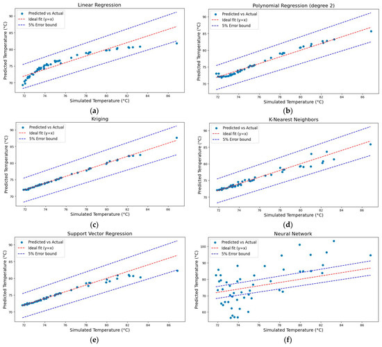 Comparison of the predicted versus the simulated temperatures for various surrogate models: (a) linear regression; (b) polynomial regression; (c) Kriging regression; (d) RBF regression; (e) support vector regression; (f) neural network.