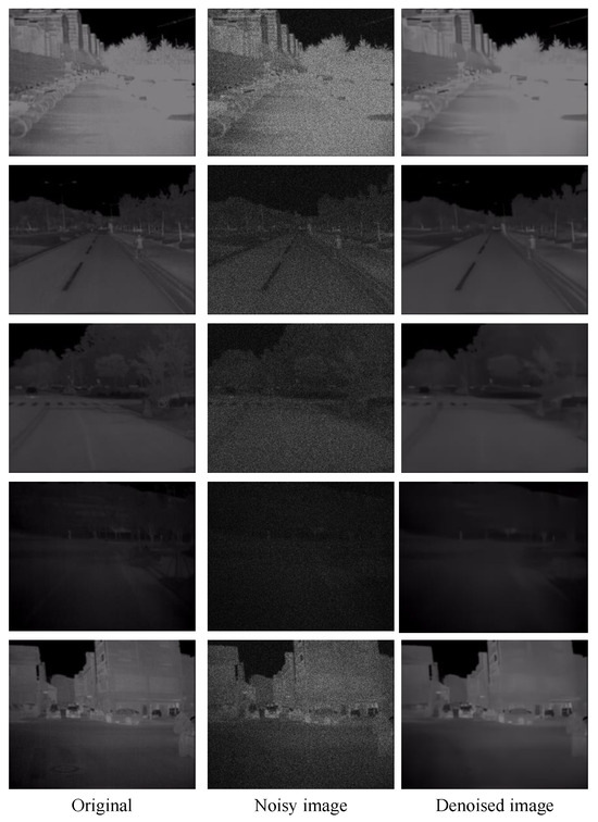 As a detection method that helps the human visual system to detect IR radiation, IR sensors output IR images that can reflect the temperature differences between objects in the scene [1]. IR sensors utilize passive imaging and operate around the clock. Therefore, they are widely used in scientific research [2], military detection [3], fire monitoring [4], fault diagnosis [5], medical analysis [6,7], and remote sensing [8]. However, in general, IR images suffer from low resolution, blurred edges, loss of details, low image contrast, and background noise due to factors including the principles of IR imaging technology, external environment distortion, and thermal motion of the sensor itself. In order to avoid noise becoming a disadvantage that restricts the development of IR imaging technology, IR denoising is particularly important.