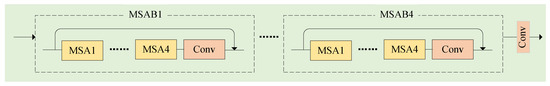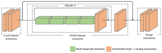In Equation (2), represents the global feature extraction module, which includes N multi-head self-attention blocks (MSABs) and a convolution operation with a convolution kernel size of K. The feature extracted by each module and the global feature are calculated by the MSABs. Its mathematical model is expressed as Equation (3):