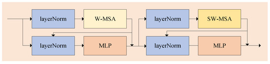 The feature tensor obtained by local feature extraction is passed to the global feature extraction module for processing. The global feature processing module comprises four multi-head self-attention blocks with the same structure, as shown in Figure 3. The calculation process of each multi-head self-attention calculation module is shown in Figure 4, the window multi-head self-attention (W-MSA) and sliding-window multi-head self-attention (SW-MSA) strategies were employed to reduce computational complexity. The global feature is extracted by the global feature extraction module, and its mathematical model is as Equation (2):
