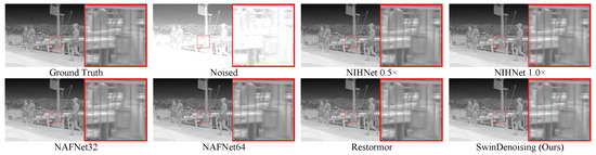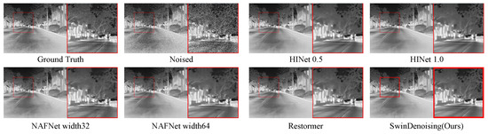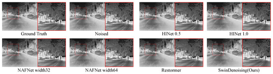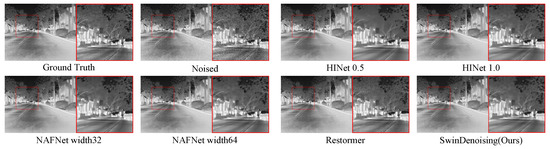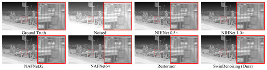 In recent years, the Swin Transformer architecture has gained prominence for its ability to capture both local and global image features effectively. The Swin Transformer [15] employs a hierarchical structure with shifted windows, allowing for more efficient computation while maintaining fine-grained feature extraction. Its multi-head self-attention mechanism enables it to model long-range dependencies in an image, making it particularly suitable for tasks such as image denoising. However, while the Swin Transformer provides a robust framework for feature extraction, directly applying it to infrared image denoising presents several challenges. Infrared images often contain complex noise patterns that require a tailored approach for effective noise suppression and detail preservation. Our method, SwinDenoising, builds upon the Swin Transformer architecture by introducing a novel fusion of local and global features specifically designed for infrared image denoising. Unlike the standard Swin Transformer, our approach incorporates an additional image restoration module to adaptively combine the extracted features, thereby enhancing its denoising capabilities under various noise conditions. This study aims to address these challenges by leveraging the Swin Transformer’s powerful feature extraction capabilities while introducing modifications that tailor it to the specific needs of infrared image denoising. Detailed discussions of related methods and further analysis of our approach’s distinctiveness are provided in the Section 2 and Section 3. The proposed SwinDenoising method significantly improves upon the shortcomings of traditional methods by incorporating a global–local feature fusion strategy through the multi-head self-attention mechanism. This approach enhances the model’s ability to handle complex and diverse noise patterns typical of infrared imagery. Moreover, SwinDenoising is designed to be robust across various noise levels, maintaining high performance in terms of PSNR and SSIM, even in challenging scenarios where traditional methods tend to oversmooth the image and lose critical structural information. Through extensive experiments on infrared image datasets, SwinDenoising has demonstrated superior denoising performance, showcasing its effectiveness in maintaining image quality while significantly reducing noise. This makes it a more reliable and advanced solution for infrared image denoising compared to existing methods. We show some denoising results of 50 dB Gaussian noise which is difficult to denoise, as shown in Figure 1, it can be seen that the proposed method can better preserve the image details while denoising. The main contributions of this study are as follows: