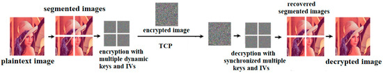 Motivated by the aforementioned works, this paper aims to realize a highly secure chaos-based image transmission system. Firstly, by integrating high-quality random numbers generated by ECRNGs [10] with the AES encryption algorithm, we propose a novel approach for encrypting segmented images using multiple keys and initialization vectors (IVs). To evaluate the performance of the proposed method, statistical analyses including HA, CCA, IE, NPCR, and UACI are conducted. The results are then compared with previous studies on image encryption that employed various techniques, such as chaos encryption, DNA coding, cross-plane joint scrambling-diffusion, and bit-level permutation [23,24,25,26,27,28,29,30,31,32,33], highlighting the advantages of the encryption method presented in this paper. Secondly, to relax the constraint of requiring identical initial states for master–slave chaotic systems in practical applications, this paper designs synchronization controls. These controls ensure that master–slave chaotic systems embedded in the transmitter and receiver can synchronize and generate identical dynamic keys for completing image encryption and decryption. Additionally, to reduce transient synchronization times, real-time synchronization is also discussed to effectively enhance system performance. Finally, to validate all inference results, a highly secure image capture and transmission system is implemented under the TCP (transmission control protocol) network protocol. In this system, the synchronization of chaotic systems and dynamic keys between the transmitter and receiver, as well as the implementation of image segmentation encryption methods, are thoroughly discussed to confirm the feasibility of this design. The subsequent sections are structured as follows: Section 2 describes the main structure and core technologies of segmented image encryption and secure transmission systems. Section 3 integrates synchronization controller design, extreme value coding, and SHA-256 to achieve synchronized dynamic key generation, applied to image encryption applications. Statistical analysis and comparisons with literature results demonstrate the significant enhancement of image encryption effectiveness with this method. Section 4 proposes the implementation of an image information encryption transmission system, including synchronization of dynamic keys and IVs within the TCP framework and system realization. Section 5 describes future research work to address the security and robust synchronization in network environments where noise interference is present. Section 6 summarizes the research findings and further works.