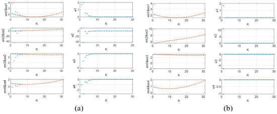 According to the system described in (9), we design the master–slave chaotic systems as shown in Equations (1) and (2). Following the earlier discussion, we design the control input as , , where . In the following, we focus on the design of matrices mentioned earlier, aiming to ensure all eigenvalues of satisfying . Additionally, we analyze the effects of the selection of matrix and variations in the eigenvalues , as well as the rank of matrix , on the convergence speed of synchronization. We conduct analysis for two cases as (1) and ; (2) and .