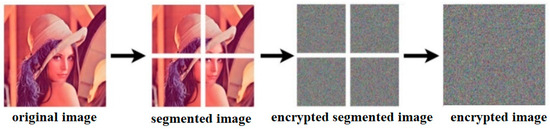 In our previously published research paper [10], the security of the ECRNGs used in this paper has been verified. Therefore, we adopt the dynamically generated binary random numbers from ECRNGs as the keys and initialization vectors (IVs) for AES-CBC image encryption. For image encryption analysis, this paper proposed a new approach of image segmentation encryption. The image is segmented into sub-images, and each segmented image is independently encrypted using different key and IV to enhance encryption quality. After encryption, all images are merged into an encrypted image. Figure 3 illustrates the image segmentation encryption for segments.