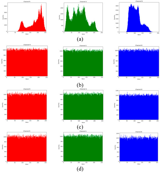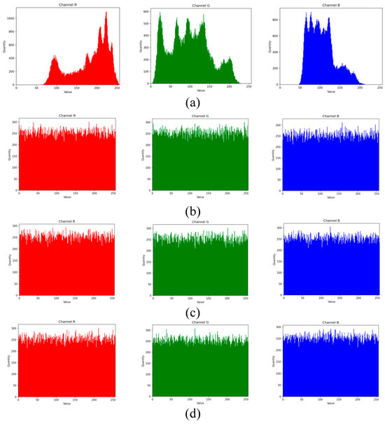 Histogram analysis (HA): HA is mainly conducted by statistically analyzing the values of each pixel to obtain the histogram of the image. Generally, in unencrypted images, distinct peaks and valleys are observed in the histogram. However, in encrypted images, these peaks and valleys may be blurred or concealed due to the encryption process which resulting in a more uniform and difficult-to-interpret distribution in the histogram. The histogram analysis results of encrypted images under different keys and IVs using the proposed approach are shown in Figure 4 and Figure 5. From Figure 4 and Figure 5, it can be observed that in unencrypted images, the distribution tends to be concentrated, highlighting specific texture features of the image. In contrast, in encrypted images, the distribution appears to be randomly dispersed and evenly distributed. Therefore, the encrypted images exhibit good encryption effectiveness and information protection capabilities.