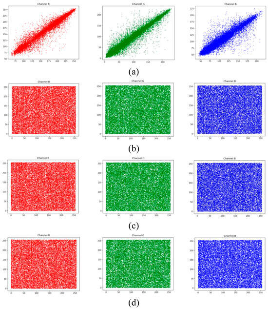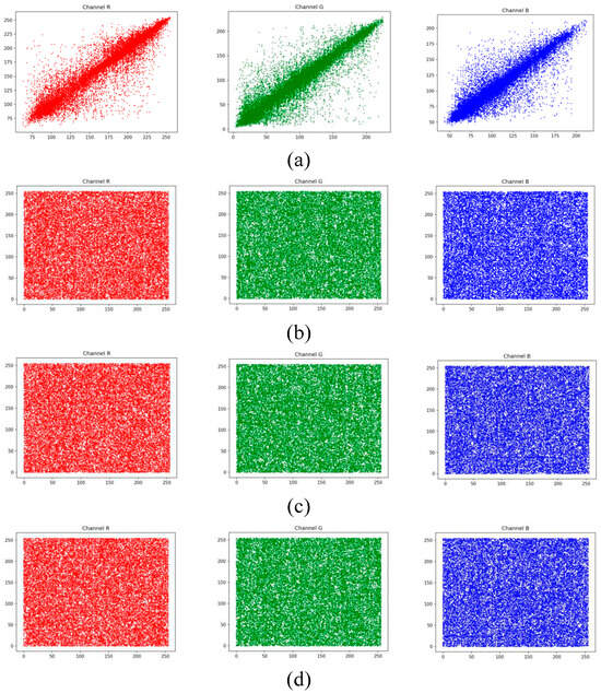 where and denote the pixel values of the two adjacent pixels and N is the number of pairs . Continuing with N set to 10,000, the unencrypted Lena image and the encrypted Lena image are subjected to CCA computation using Formula (11) above. Finally, the results are presented numerically and in scatter plots, and the CCA values obtained from the encrypted Lena images are compared with those reported in in the previous reports [23,24,25,26,27,28,29,30,31,32,33]. In the analysis results shown in Figure 6 and Figure 7, it can be observed that the points in the encrypted CCA are uniformly dispersed compared to the original image. Therefore, the encrypted image exhibits good encryption effectiveness and information protection capabilities.