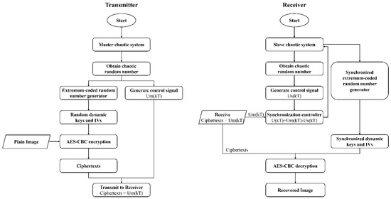Based on the discussions and comparisons above, it can be confirmed that the encryption method proposed in this paper exhibits excellent security. The RNGs embedded in the transmitter can achieve real-time synchronization and both RNGs at the transmitter and receiver, respectively, dynamically generate identical dynamic keys and IVs for AES encryption/decryption. The following will integrate the aforementioned RNGs, synchronization controller, and AES encryption algorithm to realize a high-security image transmission system with the TCP communication protocol. The flowchart in Figure 8 depicts the proposed algorithm and outlines the steps involved in implementing the high-security image transmission system.