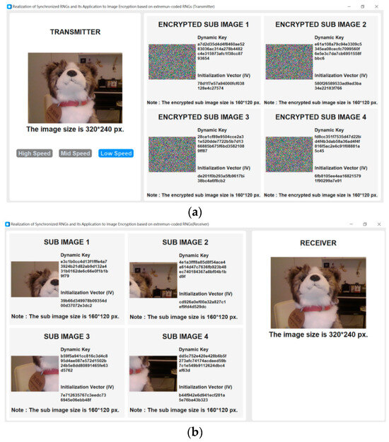 Whereby, the transmitter calculates and the receiver calculates . Through the TCP protocol, can be smoothly transmitted to the receiver. Then, it is subtracted from the calculated control component at the receiver. This process successfully implements the synchronization controller at the receiver end, thus achieving synchronization. Upon achieving the synchronization, the extremum-coded RNGs at the transmitter and receiver can generate synchronized dynamic keys and IVs. Combined with AES-CBC, image encryption and decryption are successfully accomplished. In the system implementation, we set N = 2, dividing each original image into four sub-images. Through the synchronized RNGs, four pairs of dynamic keys and IVs are generated, thus completing this high-security image transmission system. In the realization, the same matrices B and K for Figure 2b are used to ensure real time synchronization. The completed system and execution interface are shown in Figure 9. On the transmitter side, to facilitate the observation of changes and synchronization of dynamic keys and IVs, we designed three buttons with different speeds. In Figure 9, the dynamic keys, IVs, and encryption/decryption images can be observed to confirm that the system can transmit, encrypt, and decrypt normally. For detailed system operation, please visit the provided website link (https://youtu.be/bU7RdOmvrmY, accessed on 22 September 2024). From Figure 9 and the video, it illustrates that each image is divided into 4 sub-images, and utilizing synchronized dynamic keys and IVs, image encryption and decryption are successfully performed at both the transmitter and receiver, confirming the feasibility of this research.