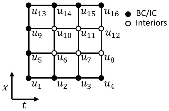 So far, we have not incorporated the boundary conditions (BCs) and the initial condition (IC), given in (1), into the linear system of Equation (13). In the space-time method, we consider the IC equivalent to the BCs. The nodes of the Chebyshev grid are split into two parts: BC/IC nodes, and interior nodes, where the solution is unknown. Let and be the set of multi-indices, introduced in [], of the BC/IC and interior nodes, respectively.