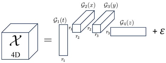 The TT format, introduced by Oseledets in 2011 [], represents a sequential chain of matrix products involving both two-dimensional matrices and three-dimensional tensors, referred to as TT cores. We can visualize this chain as in Figure 2. Given that tensors in our formulation are at most four dimensional (one temporal and three spatial dimensions), we consider the tensor train format in the context of 4D tensors. Specifically, the TT approximation of a four-dimensional tensor is a tensor with elements