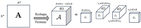 Figure 3 shows the process of transforming a matrix operator A to its tensor format, , and finally, to its TT-matrix format, .