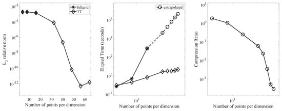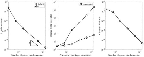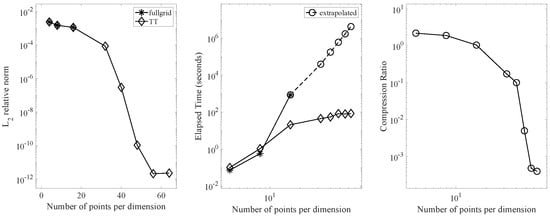 In the middle panel, we compare the elapsed time (in seconds) required for both approaches. The time taken by the full grid approach increased exponentially, while it increased linearly in the TT format. We conclude that the TT format provides approximately a 40-fold speed-up compared to the full-grid computation at a grid size of 16 nodes per dimension, and an estimated times faster speed at 64 nodes based on the extrapolated full-grid time. It is worth noting that the full-grid computation was unable to handle the grid data with 32 nodes per dimension due to memory limitations.