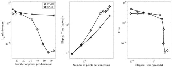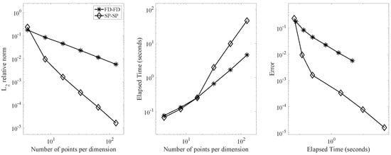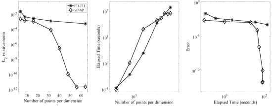 In the right panel, we plotted the errors computed by both methods against the elapsed time. The SP-SP scheme generated a highly accurate numerical solution compared to the FD-FD scheme. Specifically, the SP-SP scheme achieved an accuracy of approximately , while the FD-FD scheme only approximated the solution to the order of within the same time frame. Furthermore, the accuracy increased exponentially in the case of the SP-SP method.
