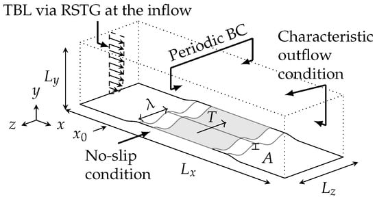 As a first step approximation to more realistic and computationally more expensive application scenarios such as aircraft wings, a CFD model based on a validated zero-pressure gradient flat plate configuration plate is selected to study the underlying physics and potential of this active drag reduction technique. For that purpose, wall-resolved LES is performed using the in-house CFD solver m-AIA (https://git.rwth-aachen.de/aia/m-AIA/m-AIA, accessed on 25 September 2024) [28,29,30], depicted in Figure 1 for the actuated case. The physical domain of the flat plate model is shown for the actuated case, where the dimensions in the Cartesian directions are , , and . The actuation parameters of the spanwise traveling wave are the wavelength , the time period T and the amplitude A. At the inflow of the domain, the Reformulated Synthetic Turbulence Generation (RSTG) method is used to initiate a TBL flow [31]. The onset of the surface actuation, analyzed in Albers et al. [28], Fernex et al. [29], is located at , where a fully developed TBL is established. The surface area for the integration of the wall-shear stress is shaded in gray. Periodic Boundary Conditions (BC) are used in the spanwise direction z, characteristic outflow conditions [32] are applied on the downstream and upper boundaries, and the no-slip condition is imposed on the wall [28].
