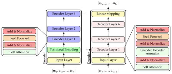 Architecture of the TR model that is used for temporal predictions (adapted from Wu et al. [33]). An encoder–decoder configuration of a transformer model is used, where the input to the encoder are the three-dimensional velocity field tensors, and the decoder outputs the time-marched velocity fields.
