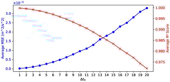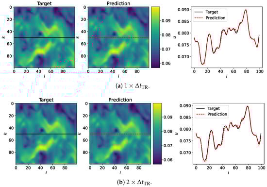 During inference, the TR can be tested for longer time sequences, as the inference step runs the model iteratively, such that , where is the TR model operator. The implementation of the inference step is available in the AI4HPC repository (https://gitlab.jsc.fz-juelich.de/CoE-RAISE/FZJ/ai4hpc/ai4hpc/-/blob/master/Cases/src/networks.py, accessed on 25 September 2024). Exemplary reconstructions provided by the TR model for the streamwise velocity (u) are shown in Figure 3. Qualitatively, it can be observed that the velocity fields predicted by the TR are in close agreement with the LES fields for . The reconstructions above are worse compared to . The larger flow features are clearly reconstructed by the TR model. However, for , the discrepancies in the TR-predicted fields are visible, which can be better observed in the line plots along the right panel. In particular, the values at locations with sharp gradients are poorly estimated. Since the sharpest gradients generally correspond to points in the velocity field with extreme values, such behavior with ML-based models can be expected as ML models with good generalizability capture the mean flow characteristics better compared to the outliers. However, up to , the line plots are in close agreement. The coefficient of determination () is also computed, and an average is found for , after which it starts to drop. The drop in , given by the first term in Equation (2), with increasing is shown in Figure 4, where the scores are also shown. As expected, a trend of increase in MSE and decrease in is observed with increasing . Given the reconstruction quality observed in Figure 3c, it can be concluded that the TR predictions are poor for . However, the time-marching of the TBL flow up to already provides high computational speed-up (shown in Section 4.2) with high accuracy. In terms of a measure to quantify the temporal evolution of the flow that the TR model is able to provide, would correspond to a convective time of about 0.40, which means about 40% of the boundary layer thickness.