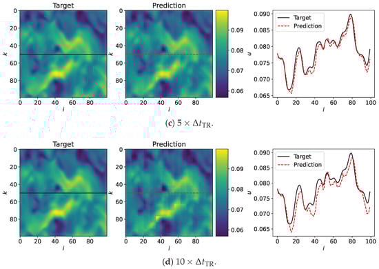Cross-section of an exemplary prediction by TR of the streamwise velocity (u) component of the TBL velocity field slice in the wall-normal direction on the i-k plane (Prediction), compared to the original LES field (Target), where i is the streamwise and k is the spanwise direction. The line plot on the right panel shows the velocity at the location shown by the red/black line in the scatter plots. Each subfigure (a–d) represents increasing TR time-steps .