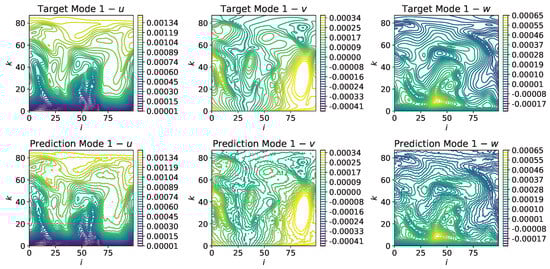 Figure 5 shows a contour plot of the mode shapes derived from the DMD of the LES and TR fields at . It can be seen that the TR modes are in close qualitative agreement with the LES modes. The TR-predicted contours are less smooth compared to the LES contours, but the discrepancy is minimal, and these probably arise from the smallest flow structures that are not captured by the TR. In order to further analyze the differences, a quantitative analysis is provided in Table 1 for the dominant mode, where , , and are compared for the LES and TR at different values of . It is observed that for , is obtained, which shows the excellent reconstruction ability of the TR model. Close agreement between the modes signify that the dominant flow features are accurately captured by the TR, which are responsible for maximum energy content of the system. For , the model starts to show worse performance and gives unacceptable values. In terms of and , the values are in close agreement until . The agreement in the mode dynamics suggests that the dynamic evolution of the velocity field predicted by the TR agrees closely with the LES fields, thus validating its use for making temporal predictions.