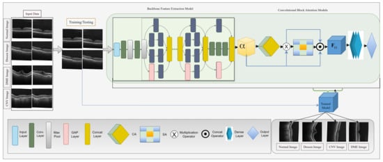 - Huang, X.; Ai, Z.; Wang, H.; She, C.; Feng, J.; Wei, Q.; Hao, B.; Tao, Y.; Lu, Y.; Zeng, F. GABNet: Global attention block for retinal OCT disease classification. Front. Neurosci. 2023, 17, 1143422. [Google Scholar] [CrossRef] [PubMed]