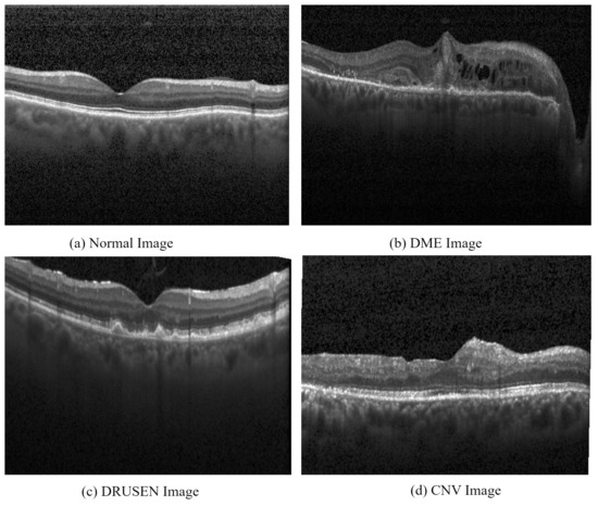 Sample of images from OCT [63]. Sub Figure (a) shows an image of a normal category; (b) shows an image having DME; (c) shows an image of Drusen; and (d) shows an image of CNV disease, respectively.
