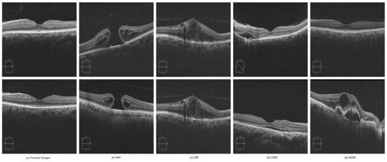 - Tan, Z.; Zhang, Q.; Lan, G.; Xu, J.; Ou, C.; An, L.; Qin, J.; Huang, Y. OCT Retinopathy Classification via a Semi-Supervised Pseudo-Label Sub-Domain Adaptation and Fine-Tuning Method. Mathematics 2024, 12, 347. [Google Scholar] [CrossRef]