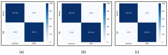 Confusion matrices: (a) Binary vs DME, (b) Normal vs. CNV and (c) (Binary vs Drusen) respectively.