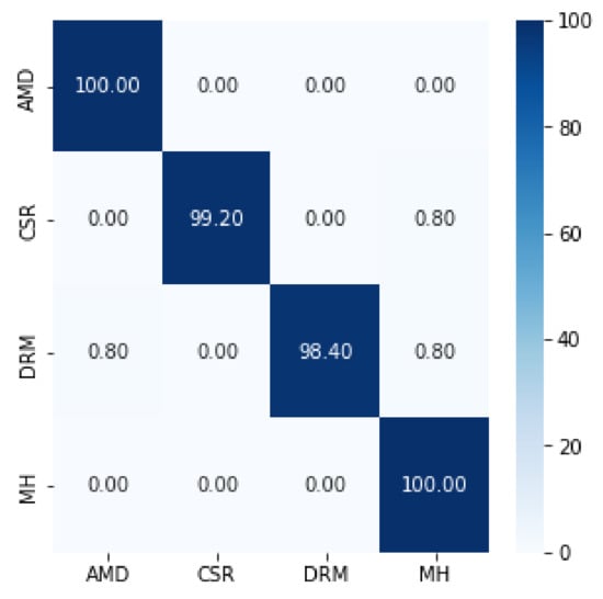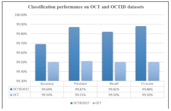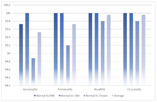 In this paper, we only considered the OCT data set [63] for checking the binary classification performance. Figure 6 illustrates the confusion matrices for the binary classifications, respectively. The analysis of these sub figures of Figure 6 of confusion matrices provide deeper information and insights about the model’s classification accuracy. In terms of binary classification, very few images are misclassified as incorrect. Overall the proposed model achieved a high average accuracy of 99.5%, a precision of 99.73%, recall of 99.96%, and F1 score of 99.96%, respectively, as shown in Figure 7.