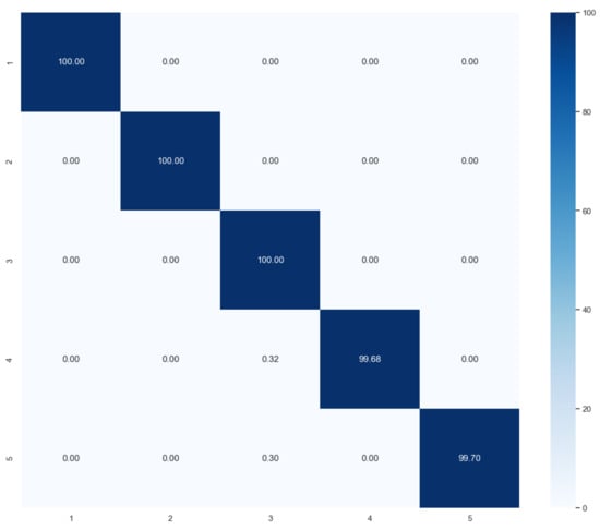Figure 8 and Figure 9 illustrate the confusion matrices for the multi class classifications for two datasets, respectively. In terms of multi class classification, the proposed model achieves high accuracy at up to 99.50% and 99.68%, respectively, as shown in Figure 10.