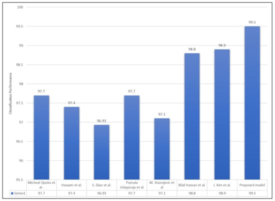 Noteworthy techniques include Adaptive Histogram Equalization [43], Modified ResNet [44], and CNN [45], with reported accuracies ranging from 93% to 98.8%, respectively. In addition, ensemble models, such as those presented by [37,39,50], showcase remarkable accuracy rates. Deep learning architectures [49] achieved accuracies ranging from 95.55% to 98.8%, respectively. Most notably, the proposed model, leveraging a Modified Attention-based module, presents promising results, boasting accuracy of 99.50% using [63]. Figure 11 shows an in-depth visual comparison of the proposed method and other techniques. This visual illustration shows the superior performance and robustness of our model in terms of classification accuracy. It highlights the significant advancements made by our approach, especially in handling complex and diverse image datasets.
