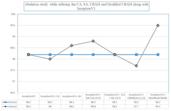 The experimental results are presented in Table 6. The standalone InceptionV3 model achieved a classification accuracy of 98.2%. However, integrating different attention modules altered its performance. Specifically, incorporating CA alone reduced accuracy by 0.2%, while incorporating SA alone increased accuracy by 0.4%. Combining both CA and SA modules, without modifying the kernel size, resulted in a 0.6% increase in accuracy. Interestingly, using (3 × 3) and (2 × 2) kernels with both attention modules led to a 0.5% decrease in accuracy. Ultimately, fusing the proposed attention-based method with InceptionV3 elevated the classification accuracy to 99.50%, marking a 1.3% improvement.