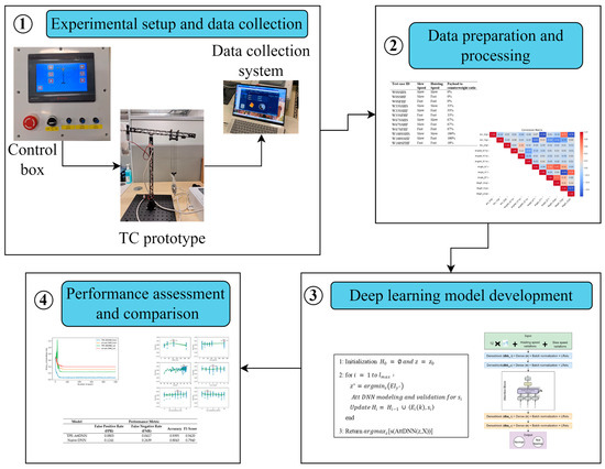 In this section, we introduce the methodology for condition assessment of payload movement in a miniature Tower Crane (TC), and the overall flowchart of the developed methodology is shown in Figure 1. The proposed approach consists of four primary stages: (1) building an experimental setup for collecting the raw data, (2) data preparation and processing, (3) development of a deep learning model (TPE-AttDNN) for condition prediction of TC payload movement, and (4) model performance assessment and evaluation (comparative analysis and ablation experiment).