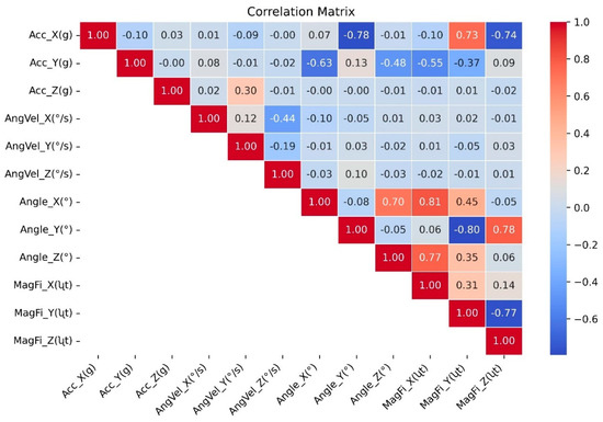 We employed the Pearson correlation method to calculate the pairwise correlation between continuous variables. The results are presented in Figure 3. An absolute correlation value greater than 0.7 signifies a strong correlation association between variables. For instance, Acceleration X(g) exhibits strong correlations with Angle Y(°) = −0.78, Magnetic field Y(ʯt) = 0.73, and Magnetic field Z(ʯt) = −0.74 for the case of COM3. The results show that neither of the two features has a very high correlation; therefore, we did not drop any signal for further analysis.