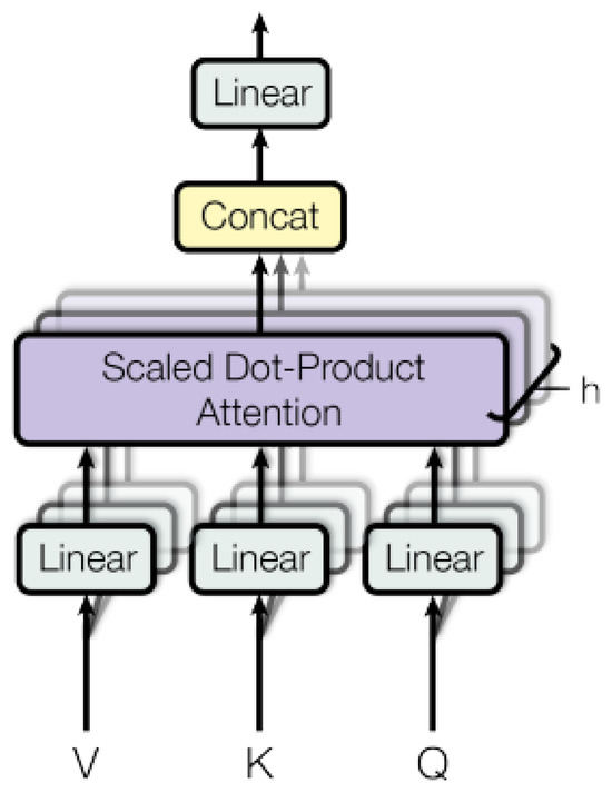 Typical Transformer architecture consists of two main components: an encoder and a decoder. However, it diverges from traditional autoencoder models by not relying on recurrence and convolutions to generate outputs. Instead, the transformer incorporates positional encoding and employs self-attention mechanisms in both the encoder and decoder. These modules are stacked together, forming a deep learning architecture that comprises multiple layers of self-attention and feed-forward neural networks [21,30]. A key novelty in the transformer model is the introduction of an attention mechanism with three key variations, notably self-attention, masked self-attention, and cross-self-attention. Also, multi-head attention is a variant of self-attention that involves performing multiple parallel self-attention operations, or attention heads, on the same input sequence. Figure 4 provides a visual representation of a multi-head attention block within the Transformer model.