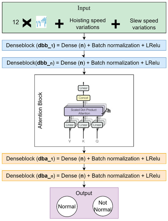 Hence, the utilization of the attention mechanism is a crucial component of the transformer model. To leverage this mechanism, we have designed a deep neural network called AttDNN, as shown in Figure 5. The proposed architecture contains a multi-head attention block inside the stacking of dense blocks. Each dense block consists of a fully connected neural network layer followed by batch normalization and LeakyRelu activation. In this architecture, the parameters, including the number of dense blocks before and after the attention block (dbb_n and dba_n), the number of neurons (n) in each fully connected layer of dense blocks, and the number of heads (h) in Attention block, will be determined using TPE optimization technique as explained in Section 5.2.