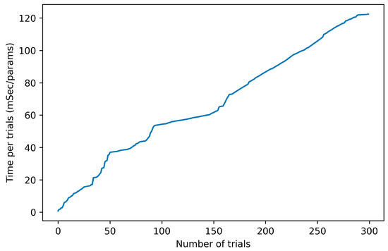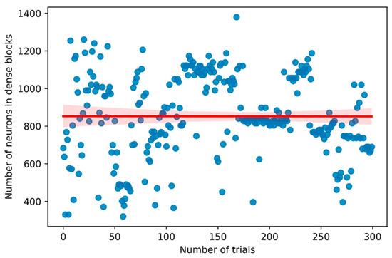 The proposed TPE-AttDNN is optimized using 300 trials. The objective function for each TPE iteration is defined based on the accuracy metric obtained from the validation dataset. The training was performed on a 13th Gen Intel(R) Core(TM) i9-13900K processor with 32 CPUs running at ~3.0 GHz. On this system, the TPE-based optimization averaged 62 s per trial. For time complexity analysis, we computed the duration for all the trails and scaled them based on the total number of training parameters in the network. These results are further illustrated in Figure 7, illustrating the relationship between the number of trials and the time per trial, measured in milliseconds per parameter (msec/params). As the number of trials increases from 0 to 300, the time per trial also increases steadily and almost linearly. This indicates that the computational complexity and the time required for each trial rise proportionally with the number of trials conducted. To further understand the time complexity of TPE, we analyzed the number of neurons in both dense blocks against the number of trials conducted. The results are shown in Figure 8. From the figure, it is evident that the variation in the number of neurons does not significantly impact the results and follows a stable trend, possibly due to the random selection nature of Bayesian TPE.