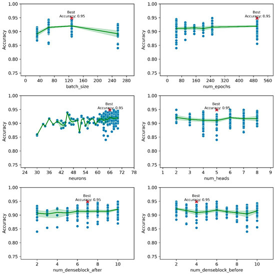 After discussing the time complexity of TPE, we now present the results of hyperparameter tuning of AttDNN as visualized in Figure 9, showing the variation of model accuracy with respect to six hyperparameters: batch size, number of epochs, the number of neurons, the number of attention heads, and the number of dense blocks before and after the attention block. Each subplot demonstrates how varying these hyperparameters impacts accuracy, with the highest accuracy of 0.95 marked in each case. The best model is seen when a mini-batch size of 128 is used and 500 epochs are set for training. With the number of neurons ranging from 30 to 70, the peak accuracy is seen at 66 neurons. The model performs best when the number of heads is set to five in the attention block. For the dense blocks before and after, the accuracy remains relatively stable across different values, achieving the highest when there are six dense blocks before and seven dense blocks after the attention block. Overall, the model converges with an increase in iterations, and the validation accuracy gradually stabilizes within a narrow range, demonstrating robust performance across these hyperparameters with optimal settings at specific values. In conclusion, TPE-AttDNN has an optimal configuration with 12 hidden layers, consisting of four dense blocks before the attention block and seven after, with 68 neurons in each layer wrapped around the layer of attention block having five heads and trained with a 128 minibatch size until 500 epochs are reached.