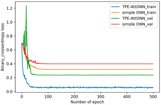 Training and Validation Loss for Naïve-DNN and TPE-AttDNN over 500 Epochs.