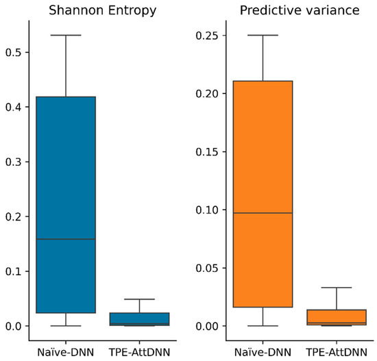 To check the learning confidence of the model, the predictions are further evaluated for uncertainty quantification, and the results are shown in Figure 11. Based on THE Shannon entropy and predictive variance, it is evident that the TPE-AttDNN model exhibits lower uncertainty in its predictions than the Naïve-DNN model. The reduced uncertainty in the TPE-AttDNN model’s predictions suggests it is a more reliable model for the given dataset.