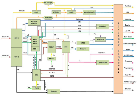 The petroleum refinery that is the subject of the current study is the “LUKOIL Neftohim Burgas” (LNB) refinery, which is one of the most complex refineries worldwide according to the Solomon Associates fuels study. More than 85% of the world’s refining capacity relies on Solomon’s fuel study. The processing scheme of the LNB refinery is depicted in Figure 2. The refinery consists of two Crude Distillation Units (CDUs)—CDU-1 and CDU-4, which fractionates the crude oil feed into dry gas, Liquified Petroleum Gas (LPG), light naphtha (fraction 30–100 °C), heavy naphtha (fraction 100–180 °C), kerosene (fraction 180–240 °C), diesel (fraction 240–360 °C), atmospheric gas oil (fraction 360–480 °C), and atmospheric residue (fraction > 360 °C). The vacuum unit of CDU-1 fractionates the atmospheric residue into light vacuum gas oil (fraction 240–360 °C), heavy vacuum gas oil (fraction 360–540 °C), and vacuum residue (fraction > 540 °C). The Vacuum Distillation Unit (VDU)-2 fractionates the atmospheric residue obtained from CDU-4 into the same fractions as explained above for the vacuum unit of CDU-1. All the above-mentioned fractions obtained during the crude oil distillation process are concurrently processed in the other refining units as follows: